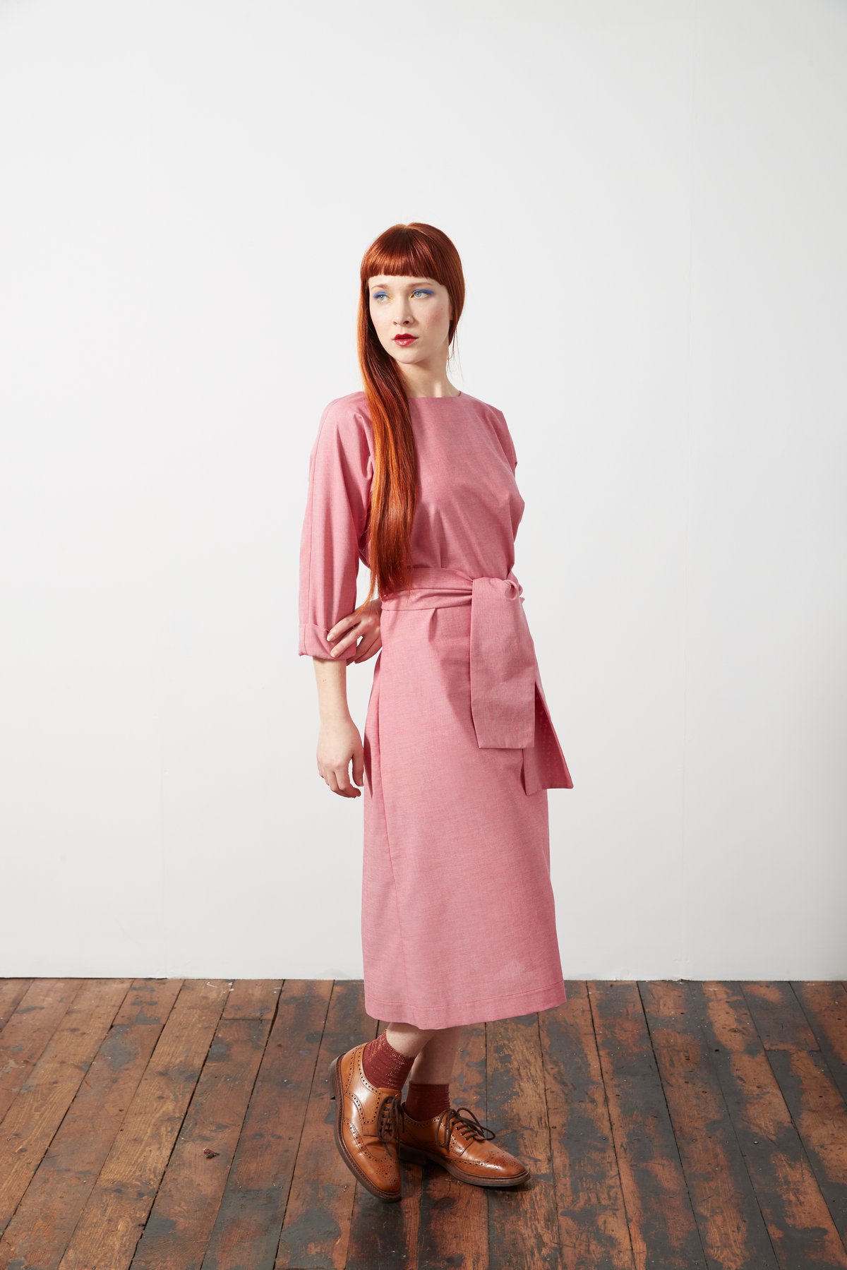 Wide sash tie dress that can be worn in a number of ways. Mid-calf length with slightly bat-wing style sleeves and a loose fitting body that can be cinched in to fit. The wide obi style sashes can be crossed over and tied at the back or at the front, or left uncrossed for a looser effect. And, of course, side-seam pockets.